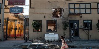 A gaping hole has been punched through the brick facade of the prominent Hotel Africa, while other structures have been peppered with bullet holes and gouged by shrapnel.