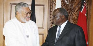 Former Ghanaian President Jerry Rawlings (left) at a news conference at Jomo Kenyatta International Airport in 2001. Looking on is Assistant Minister William Ruto.
