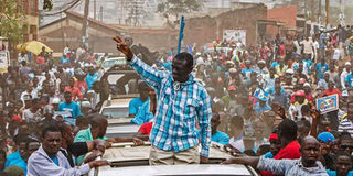 Kizza Besigye, Uganda's leading opposition leader and presidential candidate flashes the "V for victory" sign to supporters during an election rally in Kampala on February 10, 2016. He will challenge incumbent President Yoweri Museveni for the fourth time when voters go to the polls on February 18, 2016. PHOTO | AFP