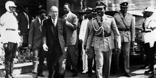 Nigerian leader General Yakubu Gowon (right) welcomes United Nations Secretary General U Thant (left) who flew into Lagos to hold talks over the Biafran refugee crisis on January 19, 1970 at Ikeja airport, during the Biafra war.