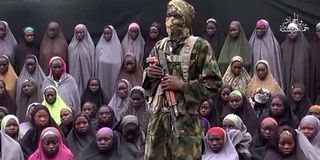 A video grab image created on August 14, 2016 taken from a video released on YouTube purportedly by Islamist group Boko Haram showing what is claimed to be one of the group's fighters at an undisclosed location standing in front of girls kidnapped from Chibok in April 2014.
