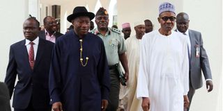 Former Nigerian President Goodluck Jonathan (left) leads President-elect Mohammadu Buhari (right) on a tour of the presidential villa in Abuja on May 28, 2015.