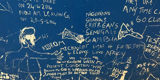 Graffiti done by migrants on a wall in Gharyan Detention Centre.