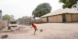 Aliou Cande's son, Boubacar, kicking a soccer ball in their village in Guinea Bissau on May 26, 2021.