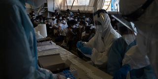 MSF Volunteers collect Covid-19 samples as migrants sit on the floor in masks.