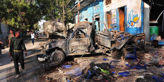 Residents walk at the scene of a blast on October 29, 2017, a day after two car bombs exploded in Mogadishu, Somalia. A Somali television journalist was killed in front of his children on December 11, 2017 by a bomb planted under the driver's seat of his car. PHOTO | MOHAMED ABDIWAHAB | AFP