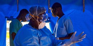 A member of the South Sudan Ministry of Health's Rapid Response Team prepares to take a sample from a man in Juba for Covid-19 testing, April 13, 2020. Sudan says there could be more infections and deaths from Covid-19 as it braces for a second wave.