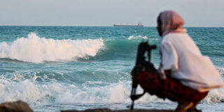 An armed Somali pirate keeping vigil on the coastline near Hobyo, northeastern Somalia in 2010.