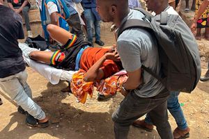 An injured man is carried away following protests in Tanzania during the country's elections on October 29, 2025.