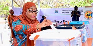 President Samia Suluhu Hassan of Tanzania casts her vote at Chamwino village office polling station in Dodoma on election day on October 29, 2025.
