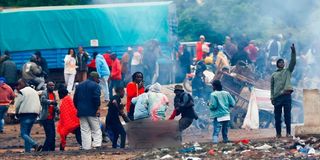 Demonstrators carry the dead body of a man killed during a protest a day after a general election marred by violent demonstrations over the exclusion of two leading opposition candidates at the Namanga One-Post Border crossing point between Kenya and Tanzania, on October 30, 2025.