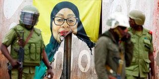 Tanzanian riot police officers walk past a vandalised campaign poster of President Samia Suluhu Hassan, following a post-election protest at the Namanga One-Post Border crossing point between Kenya and Tanzania, October 30, 2025.