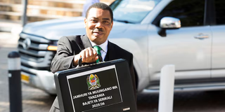 Tanzania’s Minister for Finance, Mwigulu Nchemba, holds up a briefcase containing the Government Budget for the 2025/2026 fiscal year in the National Assembly in Dodoma, Tanzania June 12, 2025.
