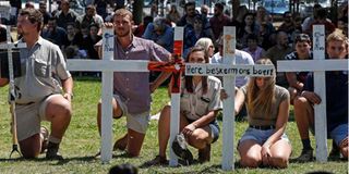 Farmers kneel as they hold white crosses during a protest and prayer day against farm and smallholding attacks and murders, at the Union Buildings in Pretoria on October 10, 2020.