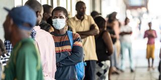 People queue at money transfer service in Bulawayo, Zimbabwe in March 2020, on the second day of a lockdown to curb the spread of the novel coronavirus.
