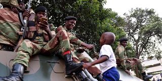 People celebrate with Zimbabwe Defence Force soldiers in the streets of Harare, Zimbabwe after Robert Mugabe's resignation in November 2017.