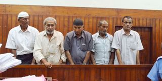 Five Pakistani Nationals who are part of the 11 suspects charged with trafficking 377.2kg of heroine (from left) Yousuf Yaqoob, Yakoob Ibrahim, Saleem Muhammad, Bhatti Abdul Ghafour and Baksh Moula during the hearing of their case in this photo taken on 23rd January 2017. The said drugs were found on the ship on which the suspects were sailors on July 3, 2014 before the ship was blown up by President Uhuru Kenyatta.