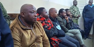 From left: Former Central Police Station boss Samson Talaam, Police Constable James Mukhwana, Peter Kimani, John Gitau, Gin Ammitou and Brian Mwaniki in court on June 24, 2025. They pleased not guilty for the murder of teacher Albert Ojwang.