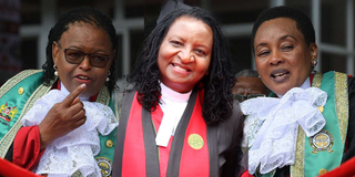 Chief Justice Martha Koome (left), Deputy Chief Justice Philomena Mwilu (right) and Registrar of the Judiciary Anne Amadi.