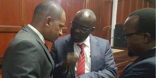 Embakasi East MP Babu Owino with lawyers Dancan Okatchi and Njiru Ndegwa at the Milimani law courts on August 29, 2023.