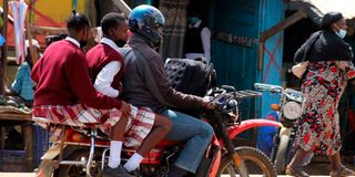 Students ride a boda boda in Elburgon, Nakuru County, as they head home for the Christmas break on December 17, 2021.
