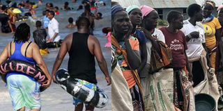 Hoilidaymakers at the Nyali Beach Hotel in Mombasa ahead of the Christmas and New Year Festivities (left) and women lining up for food on December 24, 2025 at Sitet Primary School in Angata Barikoi, Narok County. They fled their homes following clashes in the area.