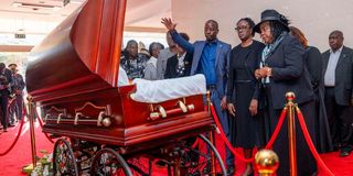 Mama Ida Odinga and her children Rosemary and Raila Junior pay their respect to former Prime Minister Raila Odinga at Moi International Sports Centre, Kasarani in Nairobi on October 16, 2025.
