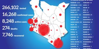This raised the total number of confirmed cases in Kenya to 16,268 and the total number of samples tested since March 13, when the country's first Covid-19 cases was confirmed, to 266,102.