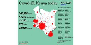 In terms of distribution per county, Nairobi had 305, the highest number of Covid-19 positive cases in the last 24 hours. Nakuru recorded 137 cases, Mombasa 74, Kisumu 60, Kericho 58 and Nandi 48. Other counties included Uasin Gishu (48), Kakamega (47), Kilifi (34), Kisii (28) Laikipia (26), Turkana 22 and Meru (20). Kajiado and Kiambu counties reported 18 cases while Garissa had 15. Busia and Machakos reported 14 cases while West Pokot had 12.