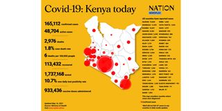 The number of confirmed Covid-19 cases in Kenya increased to 165,112 after 392 people tested positive for the virus in the last 24 hours. The new cases were discovered from 3,668 samples.