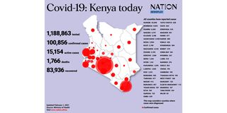 Kenya on Monday recorded 83 more Covid-19 infections, raising the total to 100,856, as well as three more deaths and 29 additional recoveries.