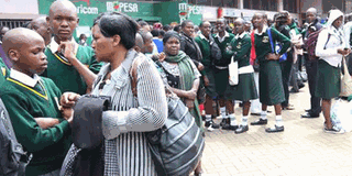 Students and parents wait for buses to their schools in Nairobi on May 5, 2015. Deputy President William Ruto asked secondary school heads to stop charging extra fees outside those specified and approved by the Ministry of Education. FILE PHOTO | BILLY MUTAI | NATION MEDIA GROUP