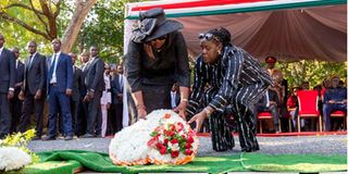 Ms Ida Odinga and her daughter Winnie Odinga lay a wreath on the grave of former Prime Minister Raila Odinga during his burial in Bondo, Siaya County on October 19, 2025. PCS