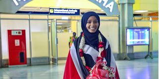 Nurse Khadija at the Mombasa International Airport after jetting back from UAE.