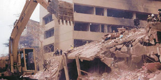 A section of Ufundi Sacco building in Nairobi after the 1998 terrorist bomb blast. In the background is the US embassy. Photo/FILE