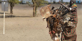 A Turkana woman carries hides skinned from goats she has lost to a biting drought that has ravaged livestock population in nothern Kenya near Lokitaung in Turkana county on March 20, 2017. PHOTO | TONY KARUMBA | AFP