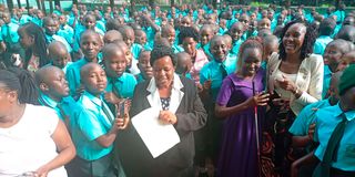Nyabururu Girls Principal Joyce Orioki (in black) celebrates with teachers, students and support staff yesterday after the school registered stellar performance in the 2025 KCSE examination.