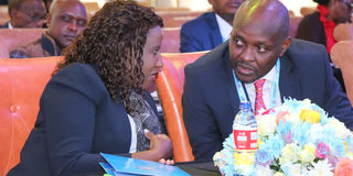 Principal Secretary for Higher Education Dr Beatrice Muganda converses with University Fund CEO Geoffrey Monari during the Second Biennial Conference on Funding Higher Education in Naivasha on February 26, 2025.