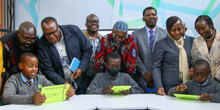 CEMASTEA Chief Officer Jacinta Akatsa, section of board members and project partners monitoring students during the Virtual STEM Lab showcase at Nairobi School Primary on June 23, 2023.