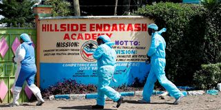 Officers from the office of government pathologist walk outside the Hillside Endarasha Academy, after a fatal fire killed and injured several pupils, in Kieni, Nyeri County, Kenya, September 7, 2024.