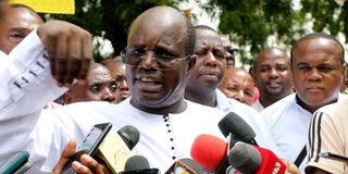 Uasu National Secretary General Constantine Wasonga addresses the press as lecturers begin their strike over unpaid allowances at the Technical University of Mombasa on 12 February 12, 2025.