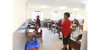 An invigilator distributes examination papers to this year's Kenya Certificate of Secondary Education candidates at Moi Girls High School in Eldoret City, Uasin Gishu County, to tackle English Paper One as the school's Chief Principal Juliana Kirui (right) looks on, on November 04, 2024.