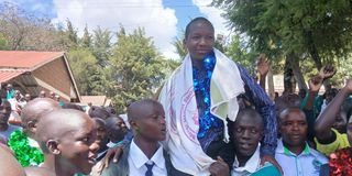 Festus Kippkirui Bett, a KCSE candidate who scored A of 82 points at Longisa Boys High School in Bomet County, is carried high by fellow students on January 10, 2026, after the release of exams results.