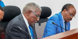 The chairman of the Commission for University Education (CUE), Prof Chacha Nyaigotti-Chacha (Left) and the Chief Executive Officer (CEO), Prof Mike Kuria, when they appeared before the National Assembly Committee on Education at the Bunge Tower, Nairobi on Thursday, April 17, 2025.