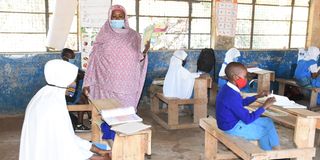 A teacher takes Grade Four pupils at Wabera Primary in Isiolo through a Mathematics lesson on October 12, 2020.