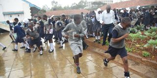 Candidates run in the rain at St George's Primary School in Nairobi on October 30, 2023 before sitting for their KCPE examinations.