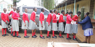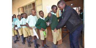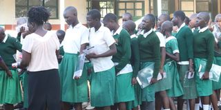 Pupils from Ndiru Primary School in Homa Bay town queue to be searched by exam officials on Monday.