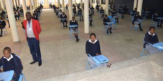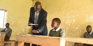 An invigilator inspects KCPE candidates at Tetu Girls Primary School in Nyeri County on October 30, 2023.