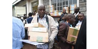 Centre managers carrying their exam materials to the County Commissioner's office in Mombasa.