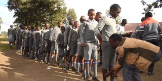 Stamdard Eight pupils at Michinda Boys Boarding and Day School in Elburgon, Nakuru County are searched ahead of the KCPE exams.